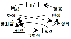 다음은 암석의 윤회과정을 그림으로 나타낸 것이다. (b)가 지하 심부에서 (a)작용에 의해 만들어지는 대표적 암석은?