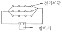전기뇌관 12개를 그림과 같이 결선하고 재발시키려 한다. 이때 필요한 소요전압은 얼마인가? (단, 뇌관 1개 저항은 1.2[Ω], 발파모션의 총길이는 100[m], 모선의 저항은 0.02[Ω/m]이며, 소요전류는 2[A]이고 내부저항은 고려치 않는다.)