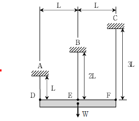 그림과 같이 강체보가 길이가 다른 케이블에 지지되어 있다. 보의 중앙에서 수직하중 W가 작용할 때, 케이블 AD에 걸리는 인장력의 크기는? (단, 모든 케이블의 단면적과 탄성계수는 동일하고, 모든 부재의 자중은 무시한다)