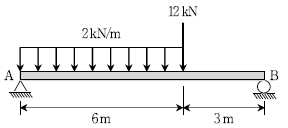 그림과 같은 하중을 받는 단순보에서 최대 휨모멘트가 발생하는 위치가 A점으로부터 떨어진 수평거리[m]는? (단, 보의 자중은 무시한다)