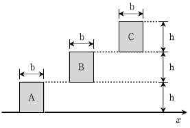 그림과 같이 동일한 사각형이 각각 다른 위치에 있을 때, 사각형 A, B, C의 x축에 관한 단면 2차모멘트의 비(IA : IB : IC)는?