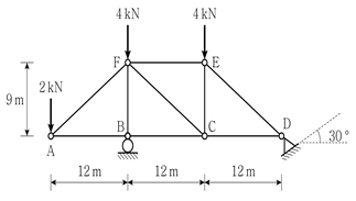 그림과 같이 트러스에 집중하중이 작용할 때, EF 부재의 부재력[kN]은? (단, 자중은 무시한다)