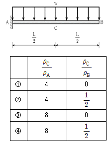 그림과 같이 등분포하중을 받는 외팔보의 고정단 A, 자유단 B 및 중앙점 C에서의 곡률반경을 각각 ρA, ρB, ρC라고 할 때, 곡률반경 비