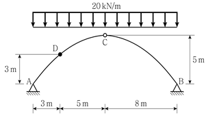 그림과 같이 3활절 아치에 등분포하중이 작용할 때, D점에 발생하는 휨모멘트의 크기[kNㆍm]는? (단, 휨강성 EI와 축강성 EA는 일정하고, D점의 위치는 계산 편의를 위한 수치이며, 자중은 무시한다)