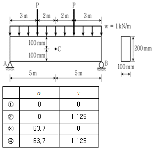 그림과 같이 직사각형 단면의 단순보에 집중하중과 등분포하중이 작용하고 있다. C점에 발생하는 휨응력(σ)과 전단응력(τ)의 크기[MPa]는? (단, 휨강성 EI는 일정하고, 자중은 무시한다)