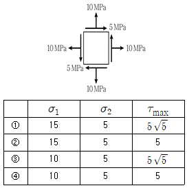 그림과 같은 평면응력상태에 있는 응력요소의 주응력[MPa]과 최대전단응력[MPa]은?