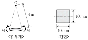 그림과 같이 일정 길이의 봉 부재 양단에 휨모멘트 M=50Nㆍm가 작용하여 곡률반경 ρ=4m인 원호의 일부 형상으로 변형되었을 때, 봉 재료의 탄성계수 E[GPa]는? (단, 봉의 단면은 한 변의 길이가 10mm인 정사각형 단면이고, 미소변형이론을 적용한다)