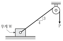 그림과 같이 정지상태의 물체(무게 W=55kN)에 케이블과 도르래를 이용하여 하중 P를 작용시킬 때, 물체가 미끄러짐이 발생하기 직전의 최대 하중 P[kN]는? (단, 바닥과 물체 사이의 최대정지마찰계수는 μ=0.5이고, 케이블과 도르래의 질량 및 도르래의 마찰은 무시한다)