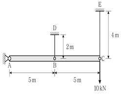 그림과 같이 B점과 C점에서 케이블로 지지된 강체보의 C점에 하중 10kN이 작용할 때, 지점 A에서의 수직 반력의 크기[kN]와 방향은? (단, 케이블의 탄성계수는 200GPa, 단면적은 100mm2이고, 모든 부재의 자중은 무시한다)