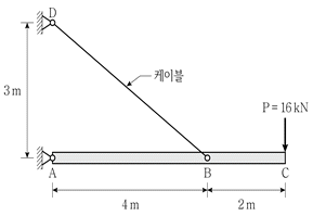 그림과 같이 강체보에 하중 P가 작용할 때, 케이블에 발생하는 길이 변형량[mm]은? (단, 케이블의 단면적 A=0.1m2, 탄성계수 E=200,000kN/m2이고, 구조물의 자중은 무시한다)