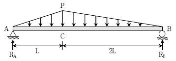그림과 같은 분포하중을 받는 보에서 B점의 수직반력(RB)의 크기는? (단, 구조물의 자중은 무시한다)