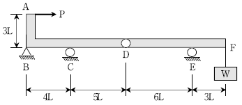 그림과 같이 절점 D에 내부힌지를 갖는 게르버 보의 A점에는 수평하중 P가 작용하고 F점에는 무게 W가 매달려 있을 때, 지점 C에서 수직 반력이 발생하지 않도록 하기 위한 하중 P와 무게 W의 비(P/W)는? (단, 구조물의 자중은 무시한다)