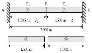그림과 같이 길이가 각각 1.505m, 1.500m이고 동일한 단면적을 갖는 부재 ⓐ와 ⓑ를 폭이 3.000 m인 강체 벽체 A와 C 사이에 강제로 끼워 넣었다. 이 때 부재 ⓐ는 δ1, 부재 ⓑ는 δ2만큼 길이가 줄어들었다면, 줄어든 길이의 비(δ1:δ2)는? (단, 부재의 자중은 무시하고, ⓑ의 탄성계수 E2가 부재 ⓐ의 탄성계수 E1의 3배이다)