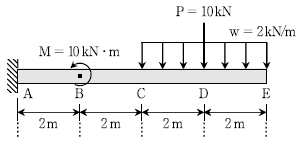 그림과 같이 모멘트 M, 분포하중 w, 집중하중 P가 작용하는 캔틸레버 보에 대해 작성한 전단력도 또는 휨 모멘트도의 대략적인 형태로 적절한 것은? (단, 구조물의 자중은 무시한다)