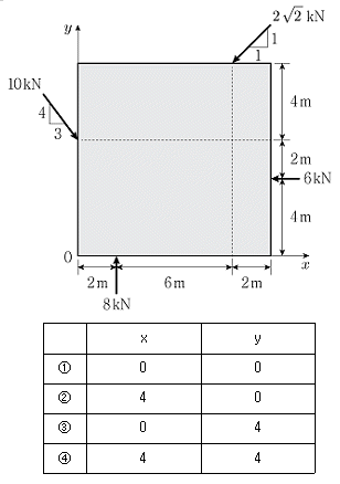 그림과 같이 정사각형에 4개의 하중이 작용하는 평면력계에서 합력이 작용하는 위치 x, y[m]로 옳은 것은?