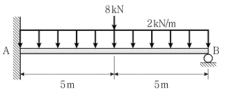 그림과 같이 부정정보에 집중하중과 등분포하중이 작용할 때, B 지점에서 반력의 크기[kN]는? (단, 보의 자중은 무시한다.)