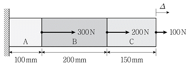 그림과 같이 세 가지 재료 A, B, C로 합성된 봉에 축하중이 작용할 때, 합성봉에 대한 총 신장량(△)의 크기[mm]는? (단, 각각의 탄성계수 EA=100MPa, EB=200MPa, EC=150MPa, 봉의 단면적은 모두 100mm2으로 일정하고, 구조물의 자중은 무시한다.)