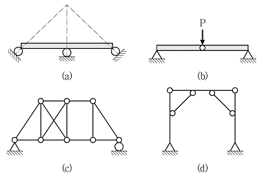 그림 (a)~(d)와 같은 구조물 중 불안정 구조물의 개수는?