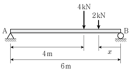 그림과 같이 2개의 집중하중이 작용할 때, A 지점과 B 지점의 수직 반력이 같기 위한 x[m]는? (단, 보의 자중은 무시하고, 지점의 수직반력의 방향은 상향이다.)