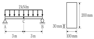 그림과 같이 직사각형 단면의 단순보에 등분포하중이 작용할 때, C점의 단면 하단부에서 30mm만큼 떨어진 높이에 작용하는 휨응력의 크기[MPa]는? (단, 보의 자중은 무시한다)