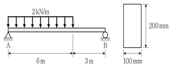 그림과 같이 직사각형 단면의 단순보에 등분포하중이 작용할 때, 직사각형 단면에 작용하는 최대 휨응력의 크기[MPa]는? (단, 보의 자중은 무시한다)