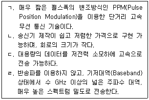 다음 보기 중 기저대역(Baseband) 무선 전송 기술방식으로 응용되는 UWB(Ultra Wide Band) 방식의 설명으로 옳은 것을 모두 선택한 것은?