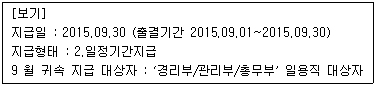 당 회사는 일용직 사원에 대해 ‘평일 8 시간’ 근무를 가정하고 있다. 아래 [보기]를 통해 ‘지급일자’ 및 일용급여 ‘대상자’를 직접 반영 후, 2015 년 9 월 귀속 급여계산 시 ‘과세총액’ 및 ‘총 소득세’는 얼마인가? 단, 급여계산에 필요한 조건은 프로그램에 등록된 기준대로 확인한다. * 본 문제는 시뮬레이션 문제로서 [실기메뉴]의 메뉴를 활용하여 문제에 답하시오.