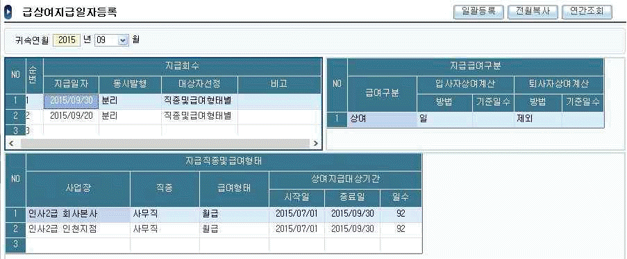 다음은 핵심ERP의 [급/상여지급일자등록] 화면이다. 다음 설명 중 옳지 않은 것은 무엇인가?