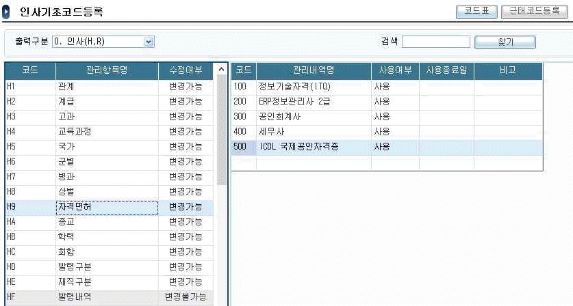 다음은 핵심ERP의 인사기초코드등록 화면이다. 다음 설명 중 옳지 않은 것은 무엇인가?
