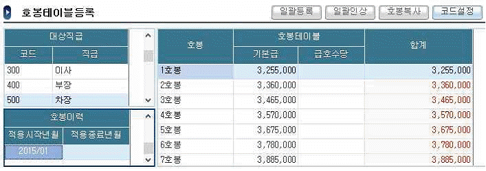 다음은 핵심ERP의 호봉테이블등록 화면이다. 호봉테이블 등록에 대한 설명 중 옳지 않은 것은 무엇인가?