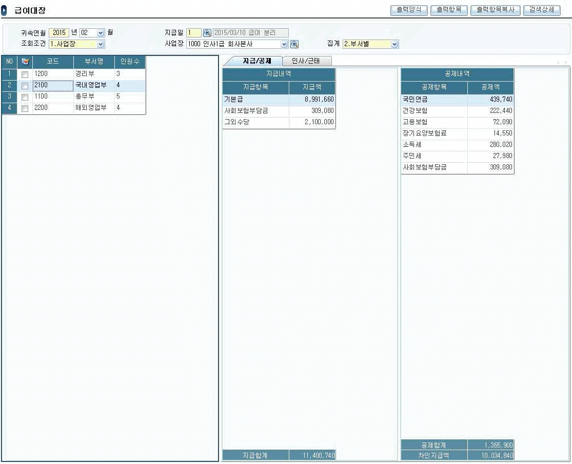 다음 화면은 급여대장 메뉴이다. 메뉴 및 화면에 대한 다음 설명 중 가장 적절한 것은 무엇인가?