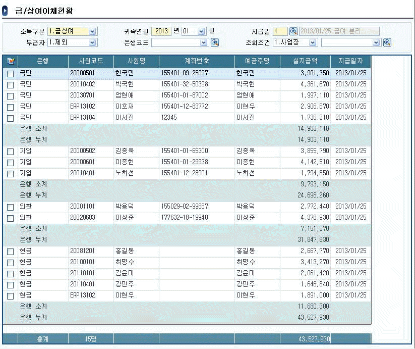 다음 화면은 급/상여이체현황 메뉴의 화면이다. 다음 화면에 대한 설명으로 가장 맞지 않는 것은 다음 중 무엇인가?