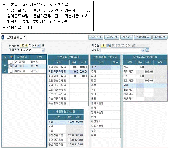 ㈜생산성은 [보기]와 같은 급여규정에 의해 각종수당을 계산하고 패널티를 적용한다. 다음 핵심ERP의 화면을 참조하여 박지성 사원의 9월 총급여액을 계산하면 모두 얼마인가?