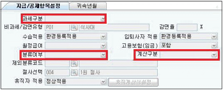 ㈜생산성은 전 직종에 대해 매달 100,000원씩 식대를 지급하기로 하였다. 다음 핵심ERP의 [지급/공제항목등록] 화면에 입력할 내용으로 옳은 것은 무엇인가? (순서대로 과세구분 - 분류여부 - 계산구분)