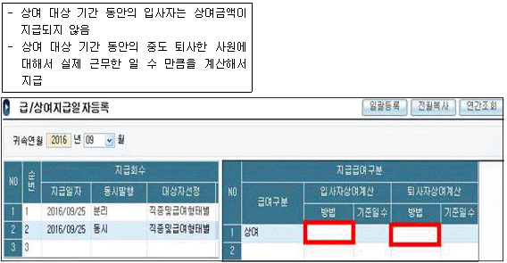 다음 [보기]는 ㈜생산성의 상여지급에 대한 방침이다. 핵심ERP의 [급/상여지급일자등록] 화면에서 설정하는 방법으로 옳은 것은 무엇인가?