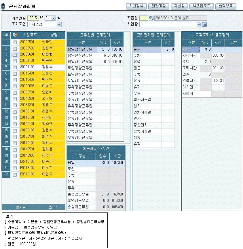 다음 근태결과입력 메뉴 화면과 다음 [보기]의 급여계산식을 참고하여 계산한 정영수 사원의 2015년 1월 귀속 총급여액은 얼마인가?