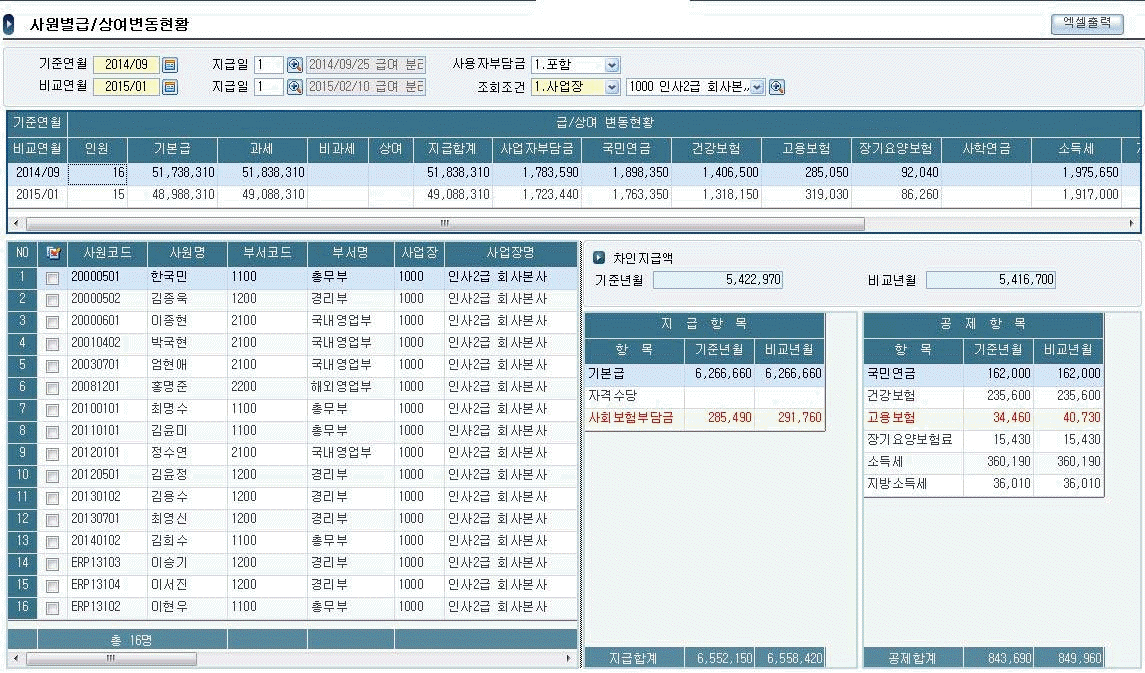 다음 사원별급/상여변동현황 메뉴 화면에 대한 설명 중 가장 적합하지 않은 것은 무엇인가?