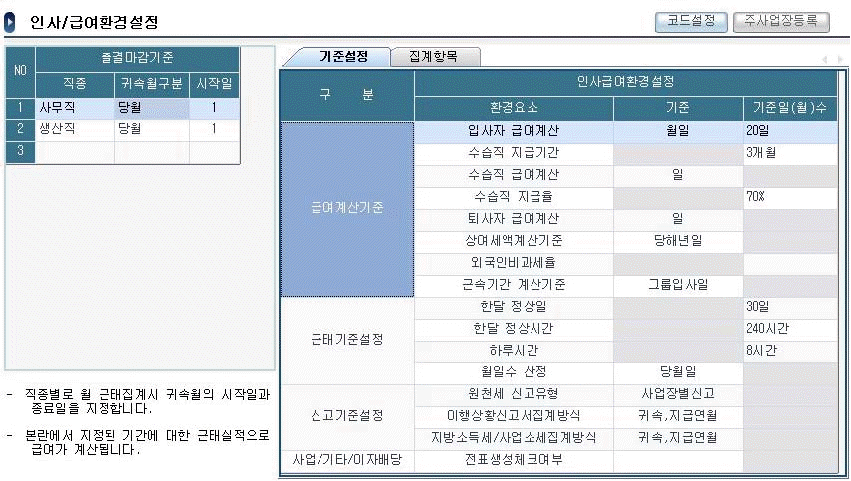 다음 인사/급여환경설정 메뉴 화면에 대한 설명 중 가장 적합하지 않은 것은 무엇인가?