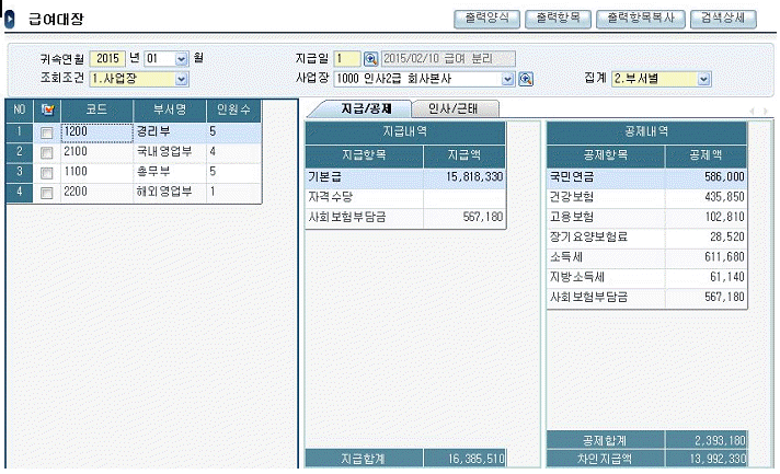 다음 급여대장 메뉴 화면에 대한 설명 중 가장 적합하지 않은 것은 무엇인가?
