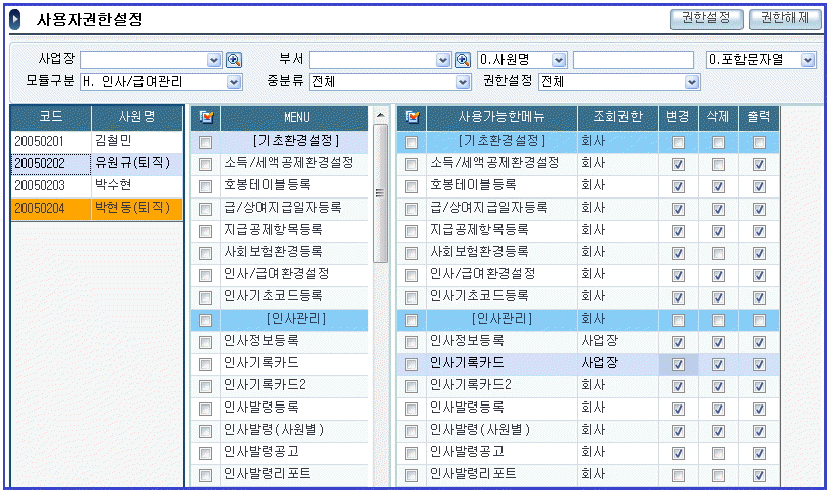 핵심 ERP의 [사용자권한설정] 메뉴에 대한 다음 설명 중 가장 적절한 것은 무엇인가 ?