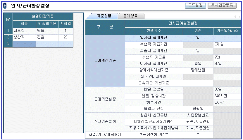 핵심ERP의 [인사/급여환경설정] 메뉴 화면에 대한 다음 설명 중 가장 적절하지 않은 것은 무엇인가?