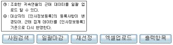 다음은 핵심ERP [근태결과입력] 화면이다. [보기]에서 설명하고 있는 작업으로 각각 알맞은 것은 무엇인가?