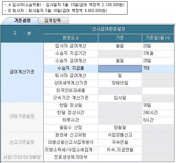 다음은 핵심ERP의 [인사/급여환경설정] 메뉴의 급여계산 및 근태기준 화면이다. 이 기준에 의해 5월 A, B 입/퇴사자의 급여계산을 하면 각각 얼마인가?
