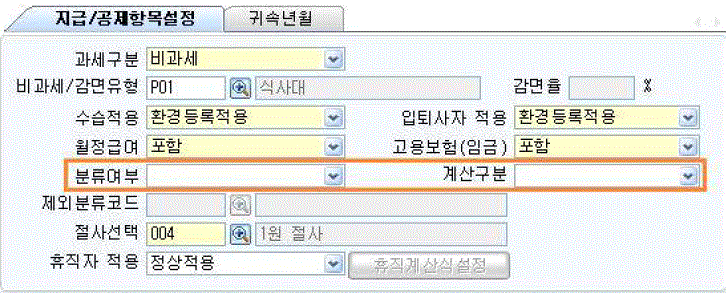 A회사는 올해부터 전직종에 대해 식사대 100,000원을 매달 지급하기로 하였다. 핵심ERP의 [지급/공제항목설정] 화면에서 [분류여부]와 [계산구분] 설정이 옳은 것은 다음 중 무엇인가? (순서대로 분류 여부 / 계산 구분)