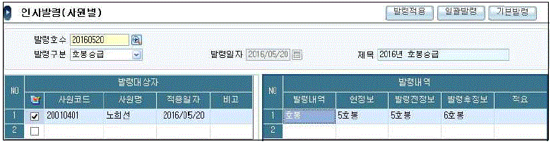 다음은 호봉승급에 대한 [인사발령(사원별)] 내역이다. 핵심ERP에서 발령정보가 자동으로 반영되는 메뉴로 옳은 것은 다음 중 무엇인가?