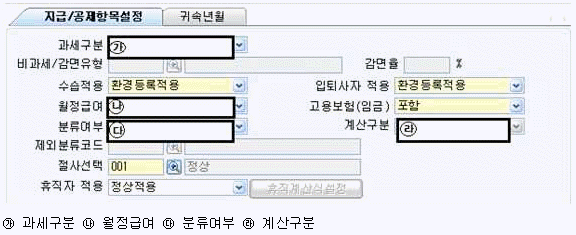 A회사는 전직종에 대해 비과세요건을 충족하는 식대 100,000원 매달 지급하기로 하였다. 다음 화면의 [지급/공제항목설정]으로 바르게 짝지어진 것은 어느 것인가?