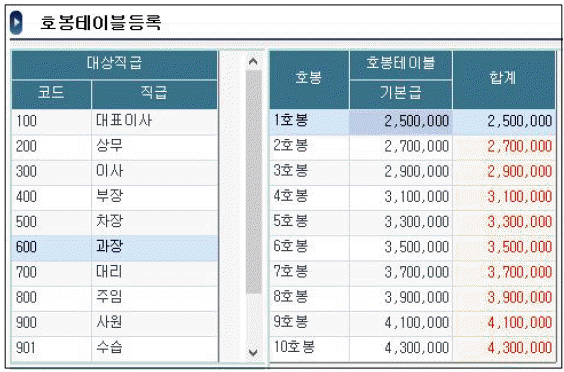 다음은 핵심ERP의 [호봉테이블등록] 화면이다. 이 화면에 대한 설명으로 옳지 않은 것은 무엇인가?