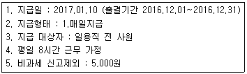 아래 [보기] 기준으로 2016년 12월 귀속 지급일 및 일용직 대상자를 직접 반영 후, 급여 일괄계산 시 대상자의 총 '비과세신고제외'금액과 총 '소득세'는 각각 얼마인가? 단, 그 외 급여계산에 필요한 조건은 프로그램 등록된 기준을 따른다. (본 문제는 시뮬레이션 문제로서 [실기메뉴]의 메뉴를 활용하여 문제에 답하시오.)
