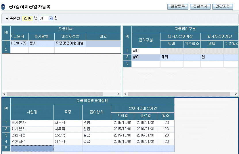 다음 중 핵심ERP의 급/상여지급일자등록 화면에 대한 설명으로 옳지 않은 것은 무엇인가?