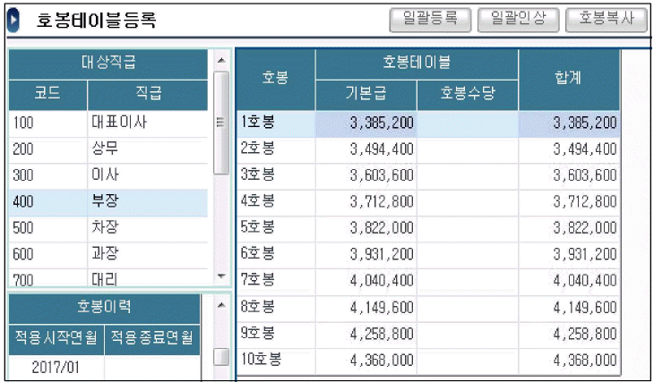 다음은 핵심ERP의 [호봉테이블등록] 화면이다. 이 화면에 대한 설명으로 옳지 않은 것은 무엇인가?